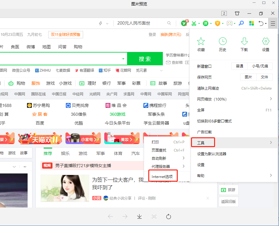 在浏览器首页的右上角的菜单栏中,点击“工具”菜单。