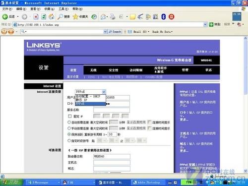 一般家庭用户都采用了ADSL,现在很多路由器厂商也考虑到了这一点,专门有了对应的设置项,避免了初学者自行配置的麻烦。ADSL要用到PPPOE这一协议,因此很多路由器把专门对应ADSL的选项也就直接叫做PPPOE,当然也有的起名叫做ADSL。Linksys提供了三个选项,动态DHCP的需要还有上级设备,一般不选;静态IP的适合小区宽带等ISP提供静态IP的用户,PPPOE则是用于ADSL用户的。静态IP设置比较简单,而DHCP我们通常用不到。因此我们重点介绍一下PPPOE这一选项的设置。我们在选择了PPPOE之后,就会出现填入ADSL用户名和密码,填好之后以后都是路由器替用户拨号了。
