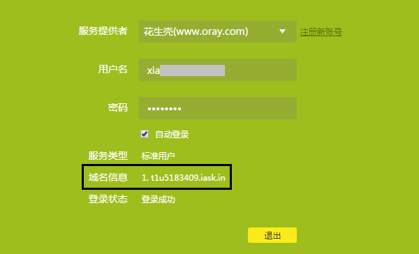 花生壳账号注册成功后,即可在路由器DDNS界面中输入花生壳账号和密码,点击登录,登录成功后,在界面中会显示其对应的域名信息,如下图: