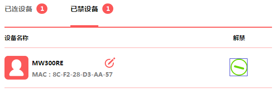 在主路由器管理界面,点击?连接设备管理?>>?已禁设备,确认扩展器未在禁用列表中,如果已被禁用,请点击?解禁。?