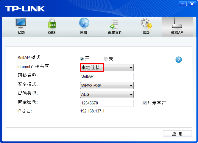 关闭模拟AP,再次开启模拟AP并重新配置无线参数与共享连接。确保共享的网络连接是电脑用于连接到Internet的网络连接,如下图(本例中电脑是通过网线连接的,所以共享的是本地连接;若是通过无线连接上网的,则需要共享无线网络连接):