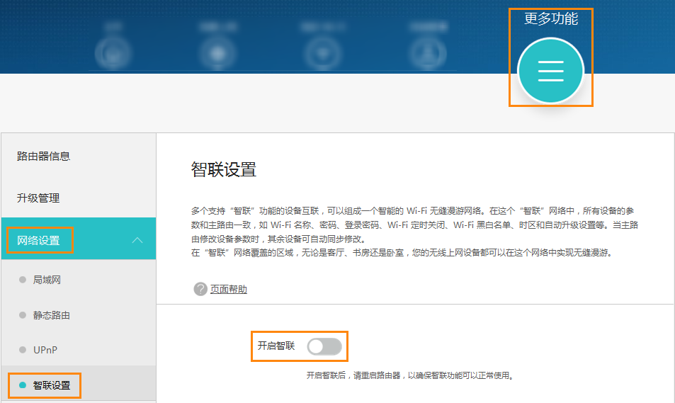 4. 重新输入新设置的密码,登录路由器配置页面。选更多功能 >网络设置 > 智联设置,关闭开启智联按钮(关闭智联后,若家庭组网中还有其它华为路由器,将无法自动智联),然后将路由器和上行用网线连接后即可开始上网。