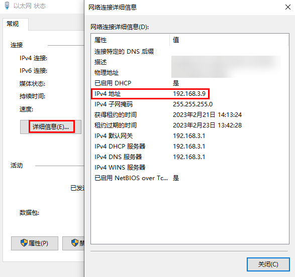 c. 右键点击以太网,选择状态,在弹出的以太网状态对话框中,点击详细信息,查看电脑IP地址是否和路由器的IP地址在同一网段,即为192.168.3.*(“*”为2~254)。