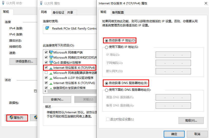 d. 若IP地址和路由器的IP地址不在同一网段,则在以太网状态对话框中,点击属性,双击Internet协议版本4(TCP/IPv4)。选择自动获得IP地址和自动获得DNS服务器地址,点击确定。