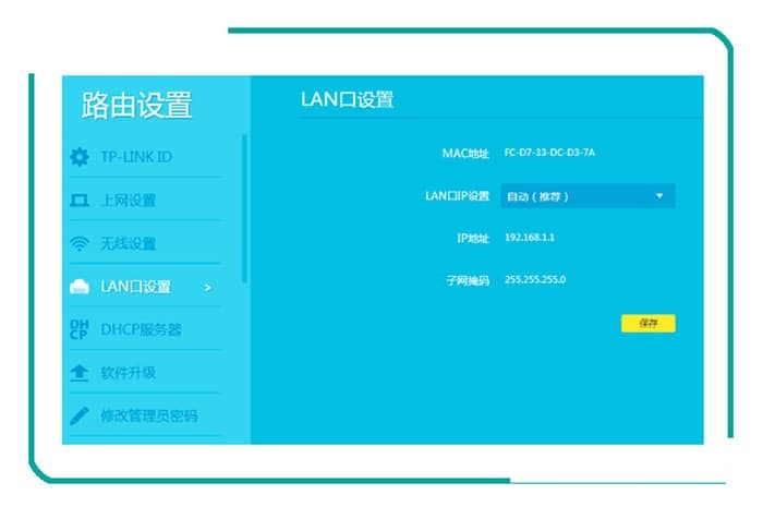 2.成功登录路由器的管理页面后,点击路由设置下面的“LAN口设置”菜单,LAN口IP设置默认为 自动(推荐)。