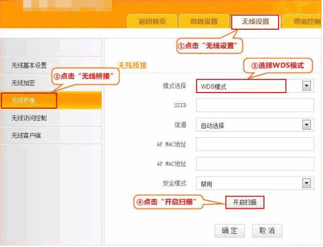 5、设置辅助路由器以扫描主路由器。扫描主路由器的无线信号。