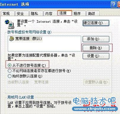 3、如果是拨号上网的用户,请先删除宽带的拨号连接,并选择从不进行拨号连接 。点击浏览器里面的工具---Internet选项----连接,如下图: