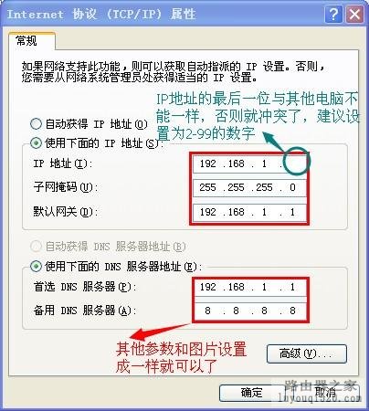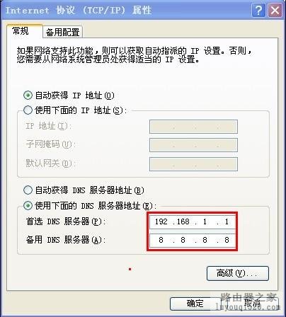 )如果能够登录QQ不能打开网页,则可能获取DNS不正确,打开“本地连接状态—属性—Internet协议(TCP/IP)--属性”,手动填写DNS服务器地址192.168.1.1和8.8.8.8。或联系运营商咨询当地DNS地址,然后手动填入。