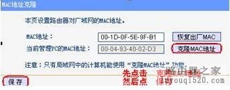 )部分服务商可能绑定了MAC地址,请使用之前单机可以上网的电脑,有线登录到路由器的管理界面,选择“网络参数—MAC地址克隆”,点击“克隆MAC地址”,然后保存,并根据提示重启路由器,观察路由器是否可以获取到IP地址;