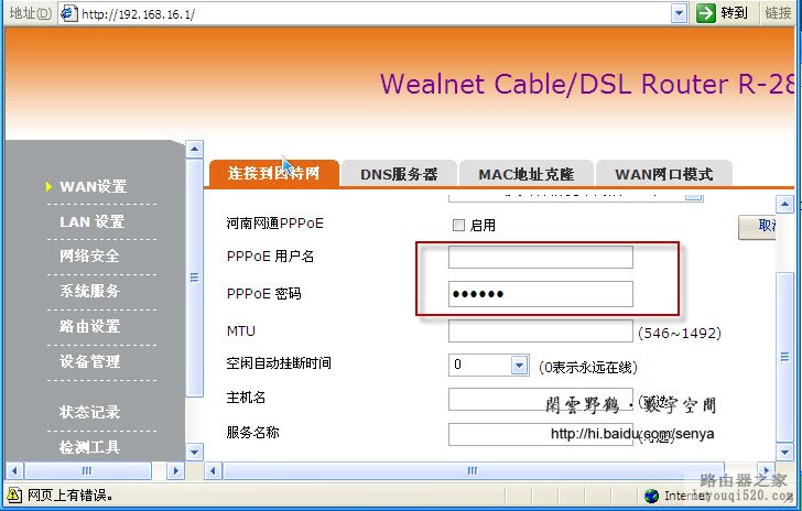 最重要的配置主是要选择上网方式,输入ISP(如电信,联通)提供给我们的一些配置参数。下面以PPPOE上网方式为例介绍。