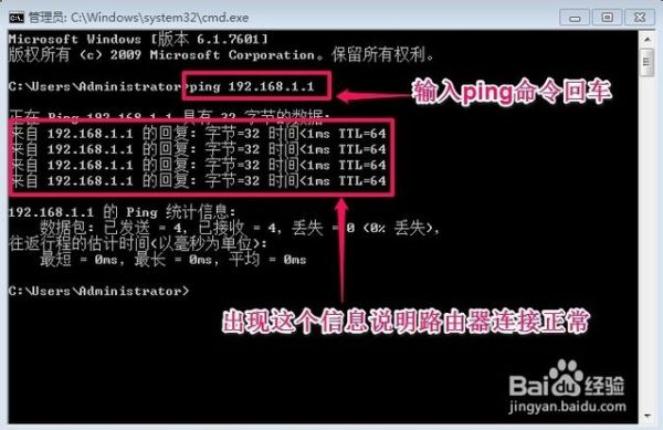 4.现在你在浏览器中输入你的路由器地址192.168.1.1【假设是这个】,看能不能进去路由器,如果还不能登录路由器,我们可以检测一下路由器是否已经连接信号,我们在开始菜单的搜索框中输入命令cmd,然后打开命令提示窗口!然后再命令提示窗口中输入ping 192.168.1.1然后回车看提示信息!
