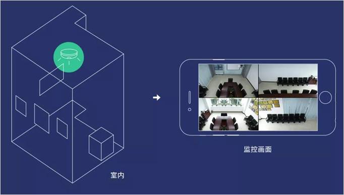 适用场景:室内小空间全方位监控(会议室、教室、办公室等)。利用水平180°+垂直180°的鱼眼镜头,可实现室内环境的无死角监控。安装在范围较小的室内空间,所有出入口的画面变动、进出人员的面部特征都可以看清,室内细节尽在掌握。