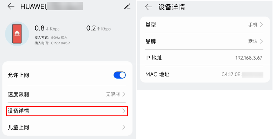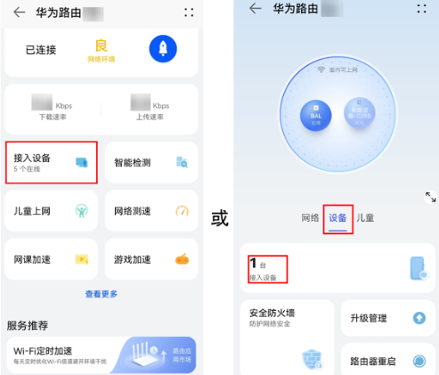 您可以通过智慧生活 App 管理接入设备或者通过 Web 管理界面管理接入设备对接入路由器的设备进行管理,例如禁止接入设备上网、限制接入设备的上网速度等。