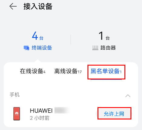 若需将设备从黑名单内移出,请在黑名单设备列表中找到该设备,点击允许上网 > 确定。