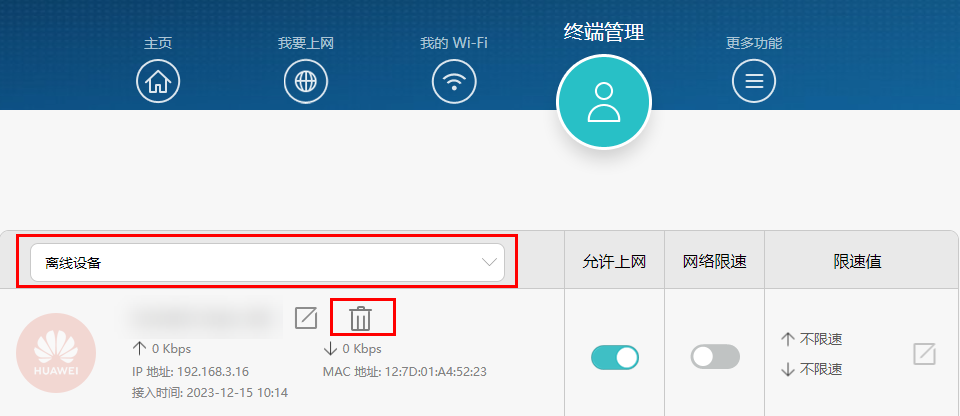 o 删除离线设备:切换到离线设备列表,点击离线设备后面的 ,即可将此设备的信息删除。