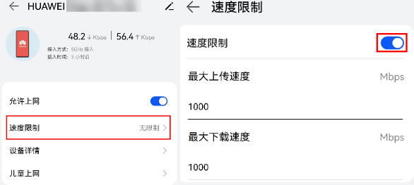 o 限制接入设备的上网速度:点击速度限制,打开速度限制开关,即可对该设备的最大上传速度和最大下载速度进行设置。