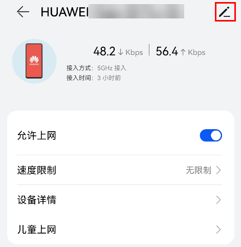 o 禁止接入设备上网:在设备详情页,关闭允许上网开关,点击确定,该设备进入黑名单列表,不能接入路由器 Wi-Fi。