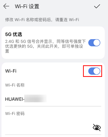 o 在智慧生活 App 的路由器管理界面中,点击查看更多 > Wi-Fi 管理 > Wi-Fi 设置(或网络 > Wi-Fi 管理 > Wi-Fi 设置),打开 Wi-Fi 开关,点击右上角的 保存(部分路由器不支持)。