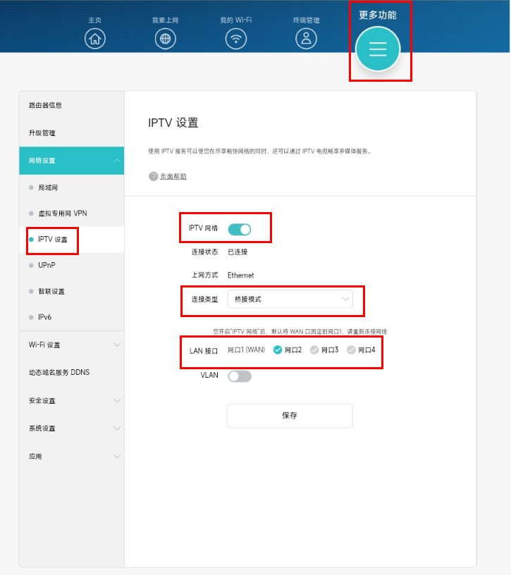 4. 点击更多功能 > 网络设置 > IPTV 设置,打开 IPTV 网络 开关。