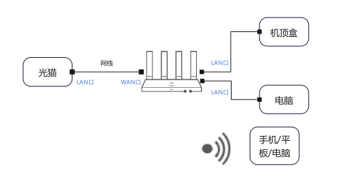 1. 建议用网线将路由器的 WAN 口(若网口有 WAN/LAN 标识,则无需区分 WAN 口和 LAN 口)连接到光猫的 LAN 口。