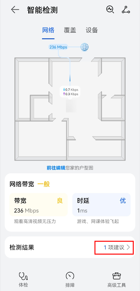3. 点击智能检测(或网络 > 智能检测),也可点击户型图,即可前往智能检测页面。