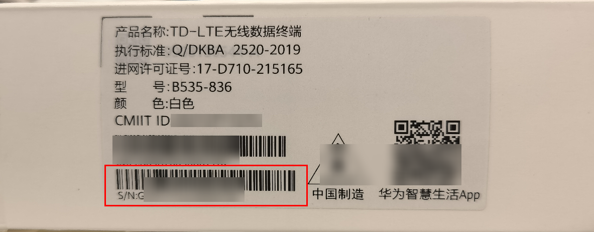 如果您保留了产品的外包装彩盒,您可以在彩盒贴标的条形码处查看设备的S/N码,此处以华为移动路由Pro的包装彩盒为例: