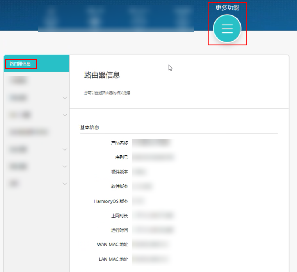3. 点击更多功能 > 路由器信息即可查看。若页面有 HarmonyOS 版本这一项,则该路由器系统为 HarmonyOS;若页面有 EMUI Router 版本这一项,则该路由器系统为 EMUI。