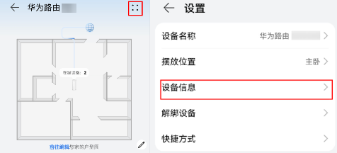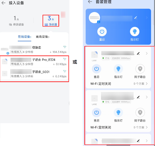 在母路由管理界面,点击接入设备(部分路由器为设备 > 接入设备),切换到路由器界面,或选择查看更多/网络 > 套装管理,选择想要查询的子路由后,点击设备信息,即可查询到该子路由的设备信息。
