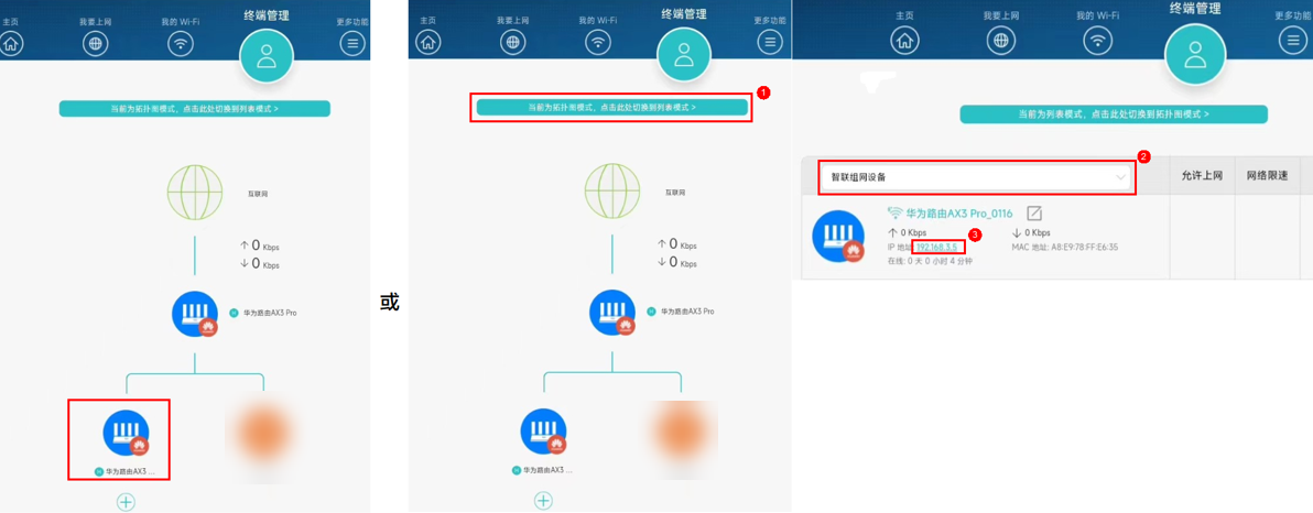 o 智联组网中的副路由:在主路由管理界面,点击终端管理,选择对应的副路由(或是在终端管理页面切换到列表模式后选择智联组网设备后,点击副路由的 IP),界面将会跳转到副路由的管理界面,输入与主路由相同的登录密码后,点击更多功能 > 路由器信息即可查询该副路由的设备信息。