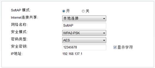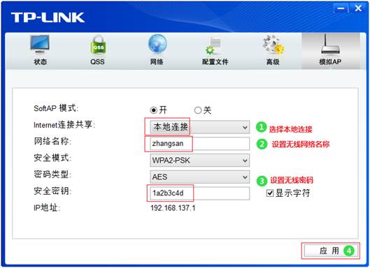 1. 在“Internet连接共享”下拉框中选择对应的网络连接(本文以本地连接为例,具体根据实际情况选择)。在“网络名称”及“安全密钥”中修改SoftAP的SSID与无线密码,点击“应用”,如下图: