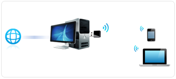模拟AP也叫做SoftAP。在可以上网的电脑上开启无线网卡的模拟AP功能后,无线网卡就可以将电脑的网络转换成Wi-Fi无线信号,手机、Pad等终端连接该无线信号后即可上网。