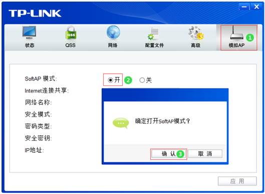 ,点击“模拟AP”,SoftAP模式选择“开”,点击“确认”打开Soft AP模式,如下图: