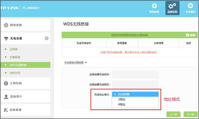 如果手机连接扩展器信号,能进入扩展器的管理界面但是无法进入主路由器的管理界面,可以尝试修改扩展器的无线地址格式为3地址。如下图: