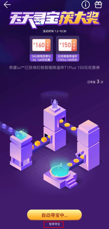 点击开始寻宝开启游戏后,未点击暂停寻宝,退出 App 后路由器会继续帮您寻宝,下次登录 App 时请记得查看寻宝结果或者奖品。