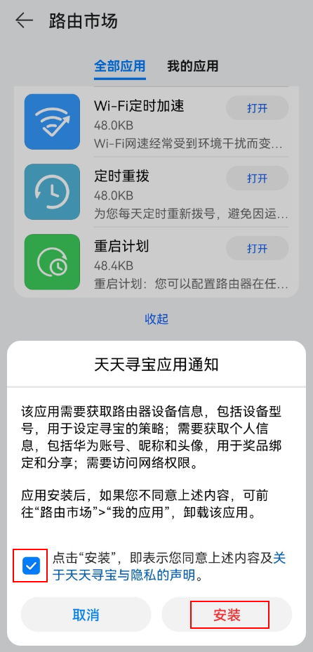 4. 在全部应用列表中选择天天寻宝,点击下载,勾选隐私声明,点击安装即可完成安装。
