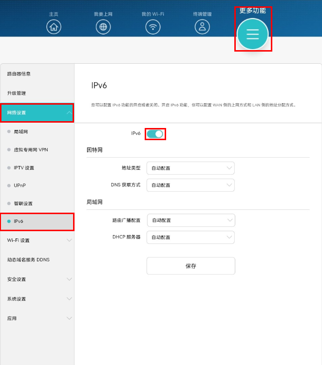 3. 点击更多功能 > 网络设置 > IPv6。