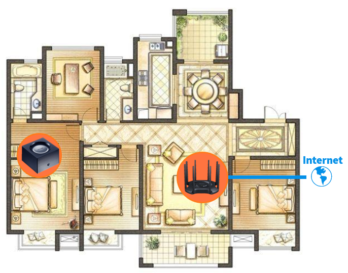 (4)?将已配对的子易展路由器转插至需要扩展信号的位置,重新接通电源即可。两台易展路由器之间原则上不超过两堵墙。