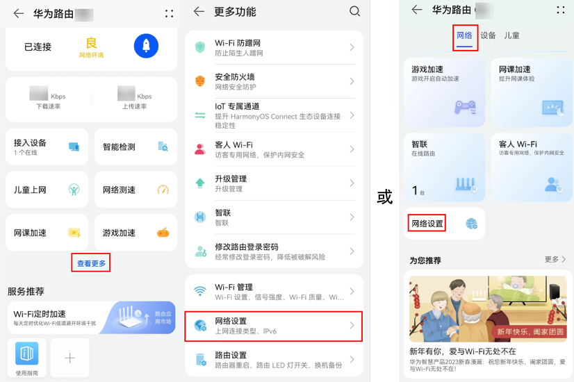华为路由器有四种上网方式:宽带帐号上网(PPPoE)、自动获取 IP 地址(DHCP)、静态 IP 及桥接。路由器在首次配置上网时会帮您自动检测当前网络环境的上网方式,按照向导配置上网即可,您也可以通过智慧生活 App 修改上网方式或 通过 Web 管理界面修改上网方式。