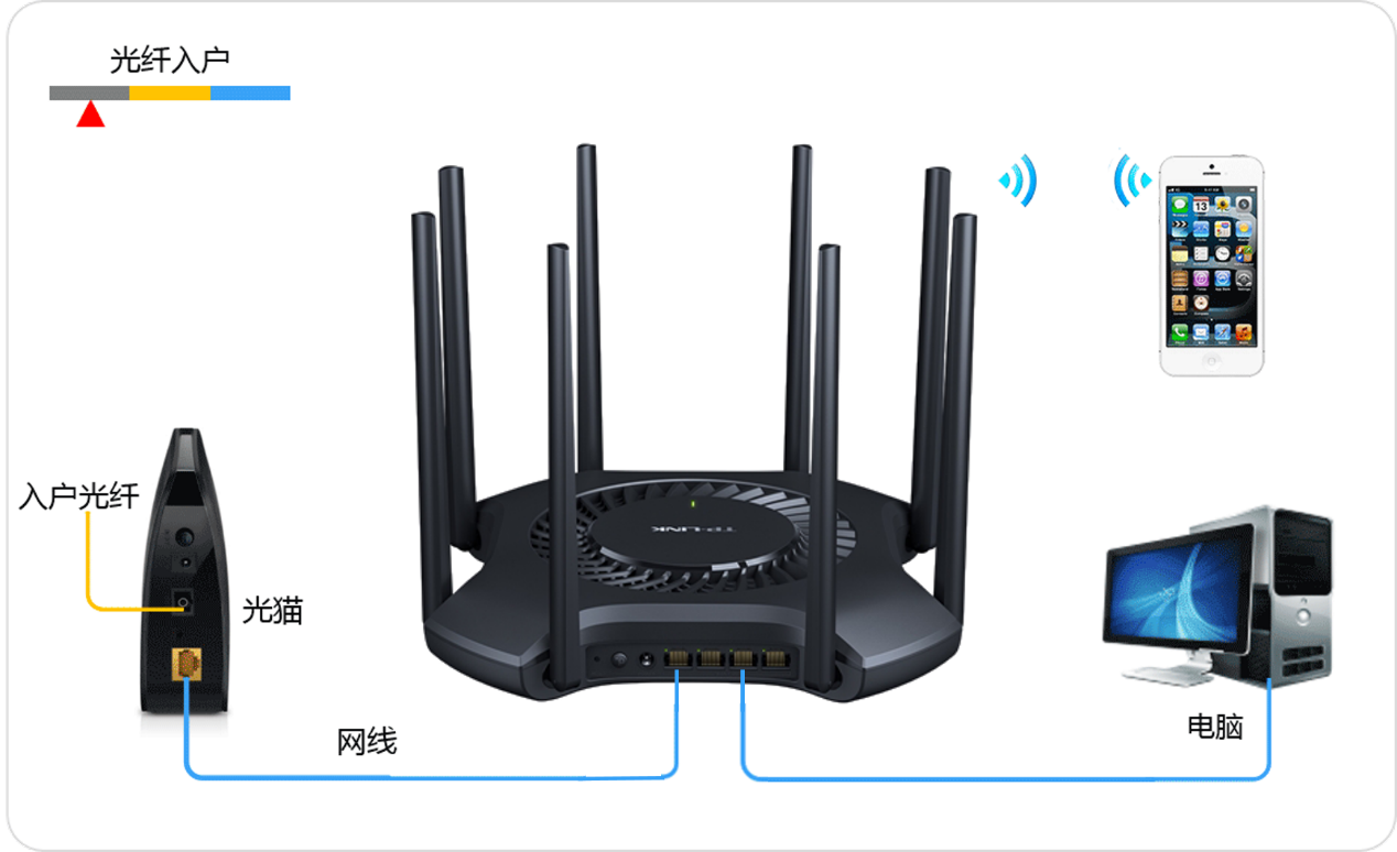 1. 请将手机/平板/电脑连接到路由器的 Wi-Fi,或者用网线连接电脑的网口和路由器的 LAN 口(若是支持网口盲插的路由器,则不用区分 WAN/LAN 口)。