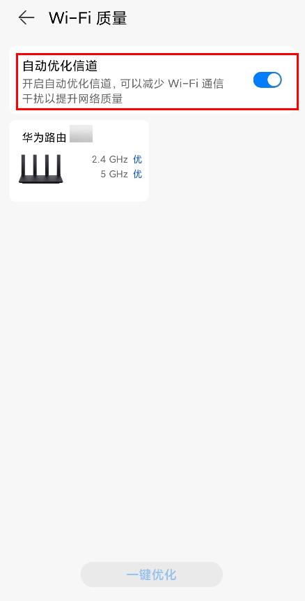 部分路由器在 Wi-Fi 质量页面有自动优化信道开关,自动优化信道开关默认开启,开启时 Web 管理界面上也会显示为自动优化信道,可以减少通信干扰以提升网络质量,您也可以选择关闭。