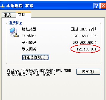 1.无线路由器要更改后台管理密码的话,用网线连接电脑。成功连接电脑后查看获取的默认网关IP: