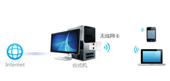 模拟?AP也叫做?SoftAP。在可以上网的电脑上开启无线网卡的模拟?AP功能后,无线网卡就可以将电脑的网络转换成?Wi-Fi无线信号,手机、?Pad等终端连接该无线信号后即可上网。