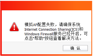 1.?设置模拟?AP?时,提示 “配置?ICS?失败 ”或 “模拟?AP?配置失败,请确保系统Internet Connection Sharing(ICS)和?Windows Firewall?服务已经开启。 ”(如下图)