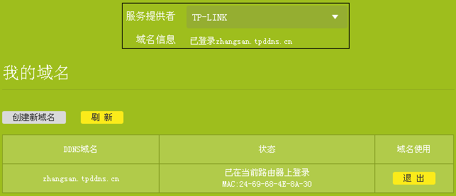 进入DDNS设置界面,服务提供者选择TP-LINK,登录TP-LINK ID,创建TP-LINK域名,并登录成功,如下图: