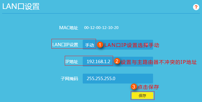 修改方法:登录路由器的管理界面,点击右下角“路由设置”,再点击左侧菜单栏的“LAN口设置”,“LAN口IP设置”选择“手动”,将“IP地址”修改为与主路由器不冲突的IP地址(以192.168.1.2为例),点击“保存”,如下图所示: