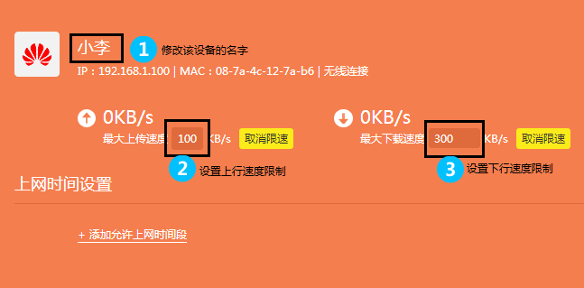 点击终端名字,修改为常用名便于管理。然后点击?限速,分别限制上下行速率的最大值。