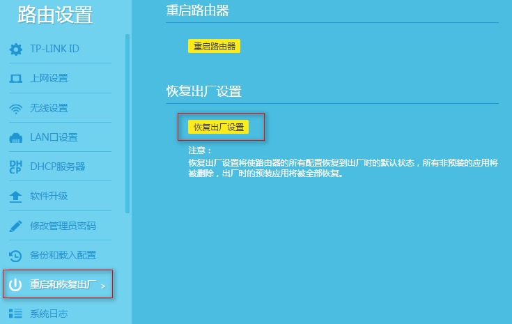仅针对能登录管理界面的用户:登录路由器管理界面,在路由设置中点击重启和恢复出厂,如下(老版本的路由器,在系统工具>恢复出厂设置中操作):