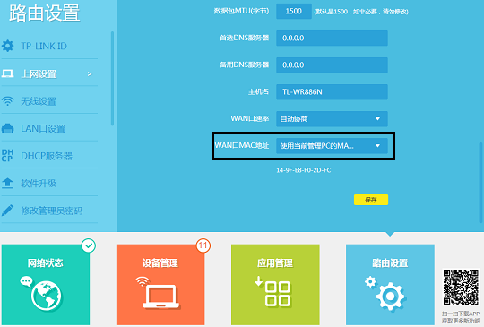 在路由器管理界面的路由设置>上网设置,在高级设置中,将WAN口MAC地址选择为使用当前管理PC的MAC地址,点击保存,如下图: