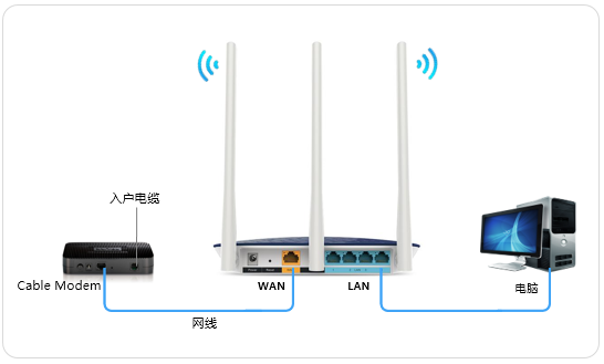 将天威宽带提供的CABEL Modem(即天威“猫”)使用网线连接到路由器的WAN口,原来连接宽带可以上网的电脑连接到路由器的LAN口,如下图所示: