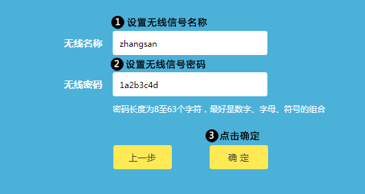 设置路由器无线信号的名称和密码,无线名称请使用数字或字母组合,请勿使用中文,设置完成后点击确定,如下图: